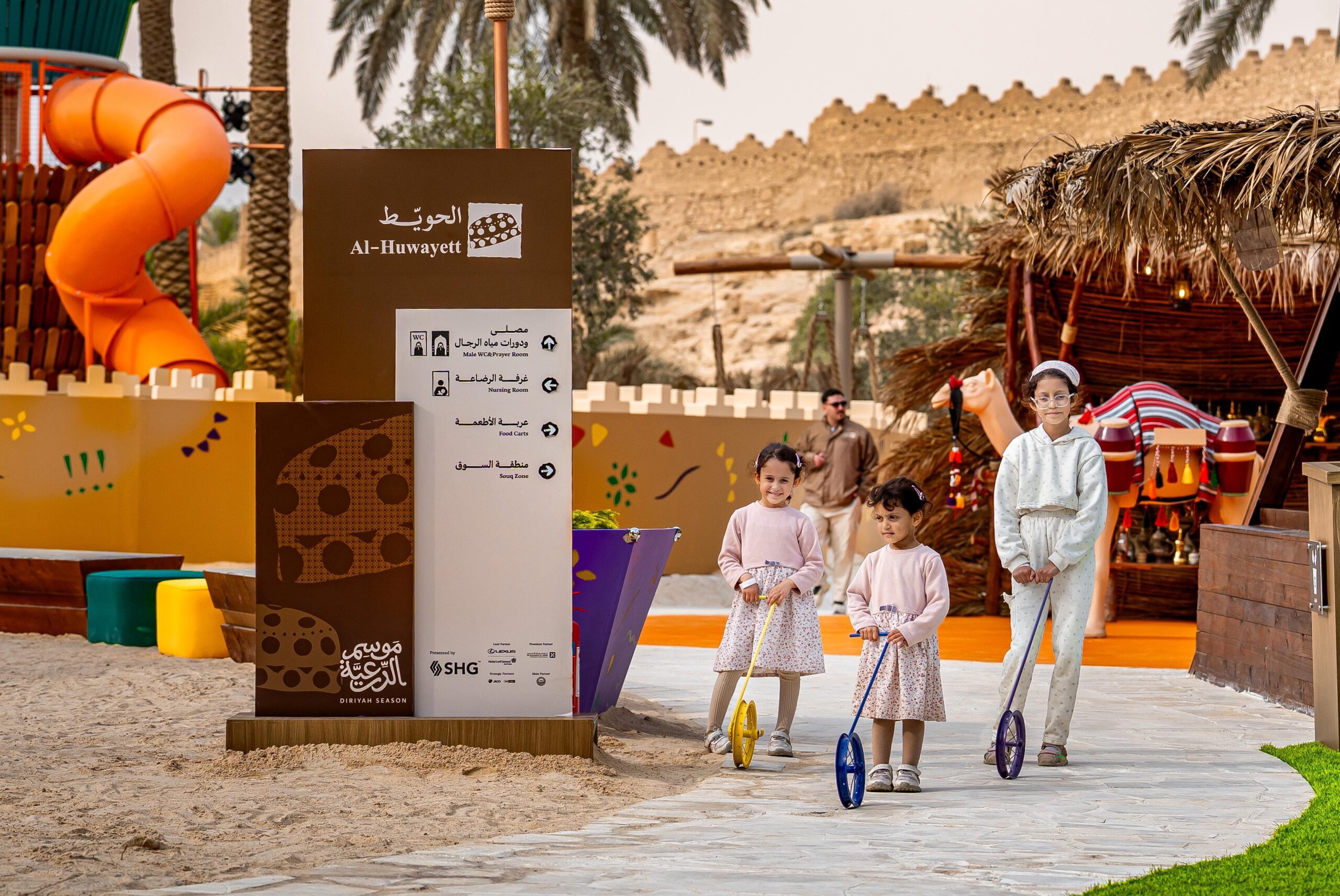 وفي إطار التجارب التفاعلية التي يقدمها الحويّط، يضم البرنامج خمس مناطق رئيسة، صُممت لتكون رحلة متكاملة تعكس مراحل الحياة في الدرعية، حيث تبدأ الرحلة من “واحة العائلة“؛ وهي مساحة مفتوحة للعب والاسترخاء،تليها منطقة “الموطن” التي تُعرِّف الأطفال بفنون اتخاذ القرار وبناء البيوت النجدية، وفي “الفيضة“ يعيش الزوّار تجربة زراعية أصيلة تعكس روح الازدهار في الدرعية، من خلال زراعة الأرض والنخيل والتعرُّف على الحيوانات المحلية، أما منطقة “النهضة” فتجسّد حيوية الحياة اليومية والتجارة القديمة بأسلوب تفاعلي يمزج الخيال بالاكتشاف الثقافي، فيما تختتم الرحلة في “الحصن“؛ وهي متاهة تفاعلية تشجّع على العمل الجماعي وتنمية مهارات التفكير وحل المشكلات بروح ممتعة ومليئة بالتحدي.