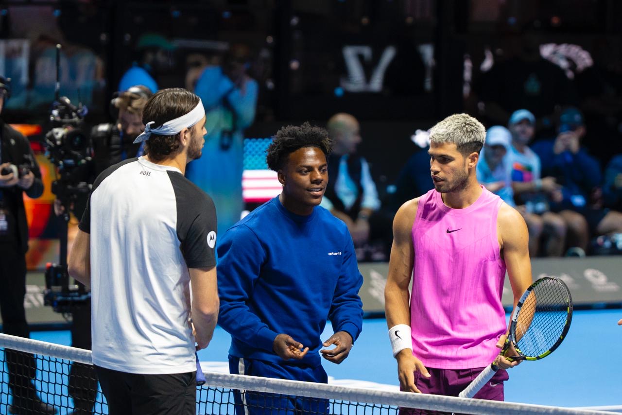 ففي أولى مواجهات نصف النهائي، قدّم ألكاراز أداءً قويًاأمام الأمريكي تايلور فريتز، حسم به اللقاء بمجموعتيندون رد (6-4، 6-2)، مستعرضًا لياقته العالية وقدرته علىالتحكم بإيقاع المباراة من بدايتها حتى نهايتها، ليبلغالنهائي بثقة بعد عرض متكامل أكد جاهزيته للمنافسة علىاللقب. وشهدت المباراة حضور عدد من المشاهير والمؤثرين،من أبرزهم المؤثر الأمريكي Speed الذي تفاعل بحماسهالمعتاد مع نقاط ألكاراز، ما أضفى أجواءً ترفيهية مميزة فيمدرجات البطولة.