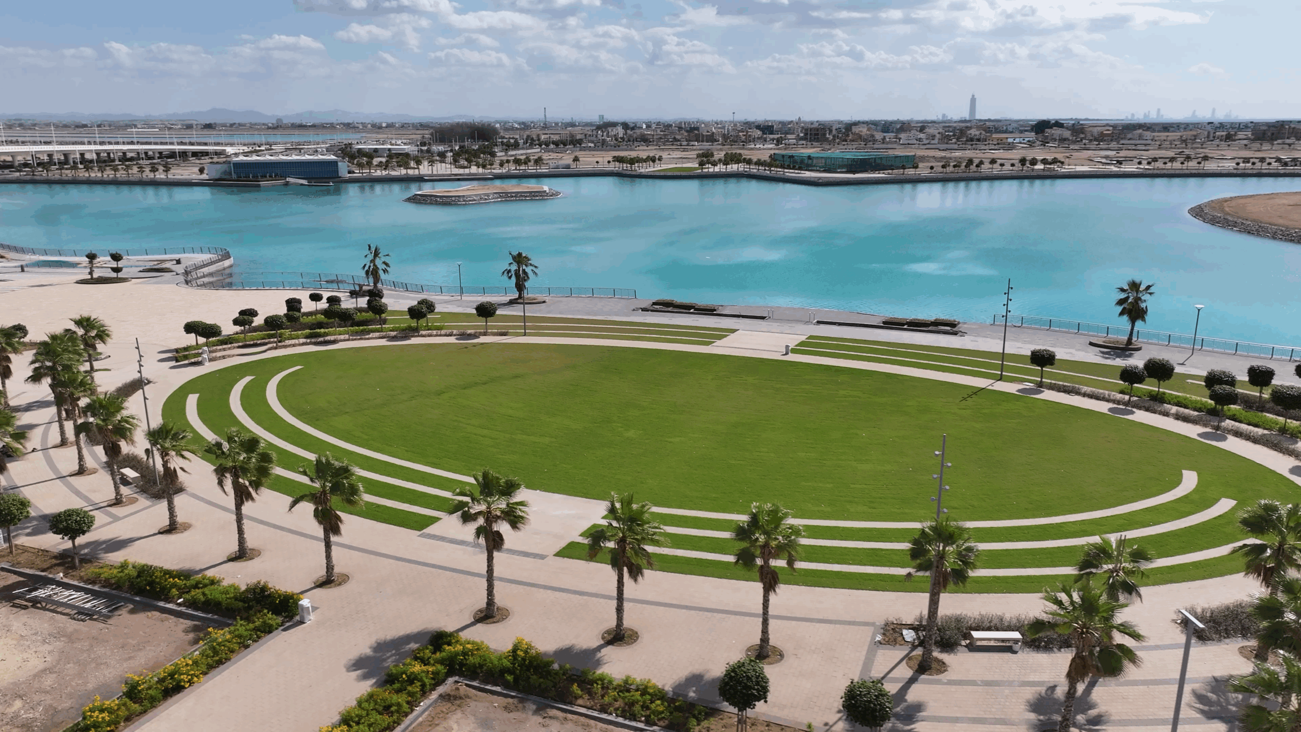 حيث تشكّل المخطط العام للوجهة من شبكة مترابطة من الممرات المائية وواجهة بحرية راقية تمتد بطول 12.4 كيلومترًا، وتشمل ممشى ساحليًا متصلًا بطول 4.5 كيلومتر، إلى جانب قنوات صالحة للملاحة، وجسور، وحدائق عامة. ويُعد الماء العنصر التنظيمي المحوري للمخطط، إذ يوجّه استخدامات الأراضي، وأنماط التنقل، والسمات العمرانية، وتحسين نمط الحياة في مختلف أنحاء الوجهة.