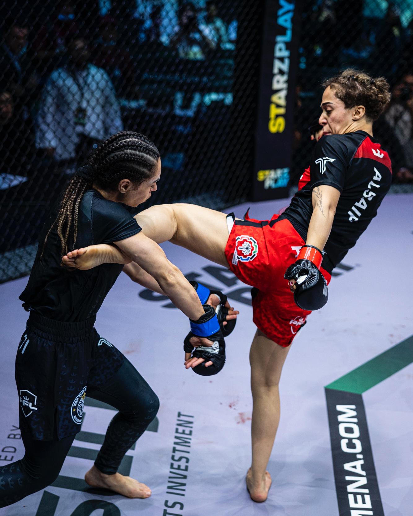 وواصلت المقاتلة السعودية هتان السيف كتابة التاريخ بتحقيق انتصارها الرابع على التوالي دون أي هزيمة، بعد انسحاب منافستها اللبنانية نور الفليطي إثر تعرضها لإصابة قوية في القدم، لتؤكد السيف مكانتها كأحد أبرز الأسماء في البطولة.