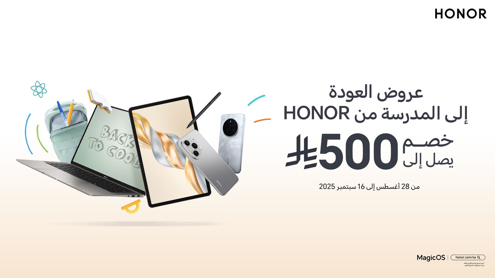 03.09.2025 الرياض، المملكة العربية السعودية – أعلنت HONOR، العلامة التجارية الرائدة عالميًا في مجال أنظمة الأجهزة الذكية المعززة بالذكاء الاصطناعي، اليوم عن عروض “العودة إلى المدرسة” لفترة محدودة في المملكة العربية السعودية، وذلك ابتداءً من 28 أغسطس وحتى 15 سبتمبر 2025. ومع استعداد الطلاب وأولياء الأمور والمهنيين لبداية موسم دراسي جديد، تساعدهم HONOR على الاستعداد بالأدوات المناسبة وبأسعار لا تُنافس.
