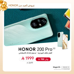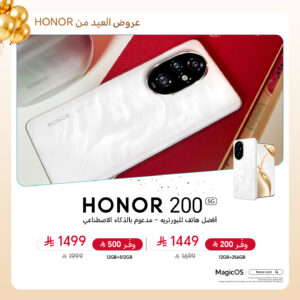 هاتف HONOR 200  نسخة (12GB + 512GB) الآن 1,499 ريال سعودي بدلاً من 1,999 ريال سعودي (خصم 500 ريال سعودي).