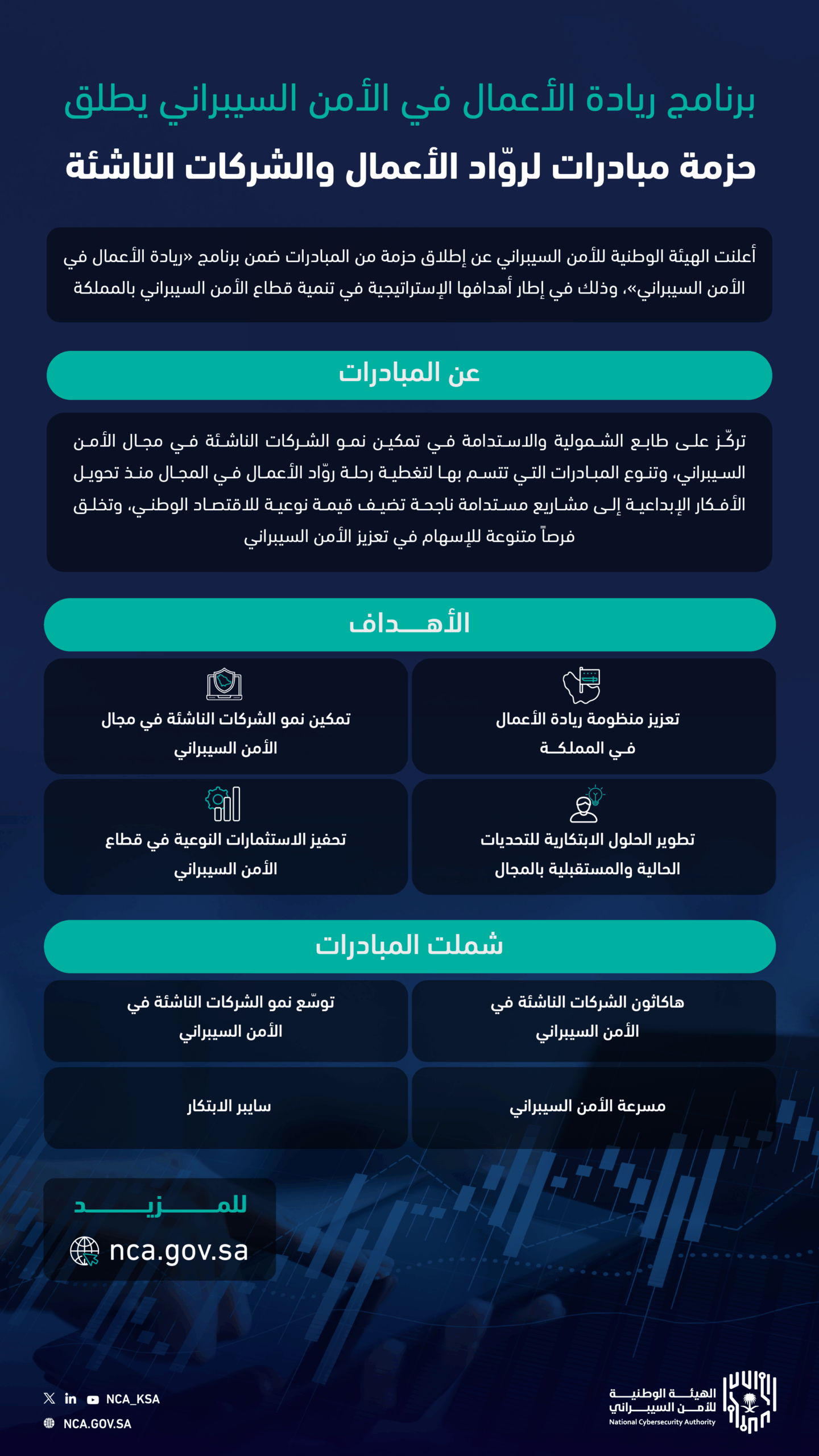 وشملت المبادرات «هاكاثون الشركات الناشئة في الأمن السيبراني، توسّع نمو الشركات الناشئة في الأمن السيبراني، مسرعة الأمن السيبراني، سايبر الابتكار»، حيث تستهدف خلق بيئة تنافسية جاذبة للاستثمار في قطاع الأمن السيبراني، وإتاحة فرص النمو والتوسع لرواد الأعمال في القطاع، من خلال دعم تأسيس الشركات الوطنية الناشئة، وتمكين شركات الأمن السيبراني الوطنية الواعدة بوصفها أحد أعمدة التنويع الاقتصادي وتعزيز مقومات الاستدامة وريادة المملكة في مجال الأمن السيبراني.