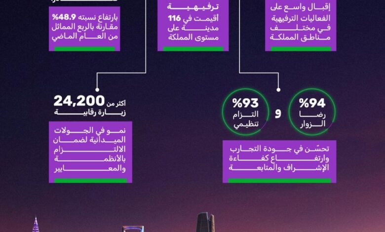 وفي الجانب التنظيمي، أصدرت الهيئة 1,839 ترخيصًا خلال الربع الثالث، بنسبة ارتفاع بلغت 48.9% مقارنة بالربع المماثل العام الماضي، شملت مختلف أنواع الأنشطة الترفيهية والعروض الحية والمراكز الترفيهية والمواهب الفنية. كما بلغ عدد الزيارات الرقابية أكثر من 24,200 زيارة بارتفاع نسبته حوالي 4%، ما يعكس مواصلة الجهود الرقابية لضمان التزام الأنشطة الترفيهية بالأنظمة والمعايير المعتمدة.