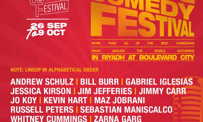إطلاق مهرجان الرياض للكوميديا الأول من نوعه في بوليفارد سيتي خلال الفترة من 26 سبتمبر إلى 9 أكتوبر 2025. يضم أكثر من 50 نجمًا عالميًا، أبرزهم كيفن هارت، الحائز على جائزة مارك توين لعام 2024. يشارك أيضًا جيمي كار، أندرو شولتز، غابرييل إغليسياس، ويتني كامينغز، سيباستيان مانيسكالكو، بيل بور، جو كوي، جيم جيفريز، جيسيكا كيرسون، راسل بيترز، وماز جبراني. يعد المهرجان أحد أكبر الفعاليات الكوميدية عالميًا، ومن المقرر الإعلان عن أسماء إضافية قريبًا.
