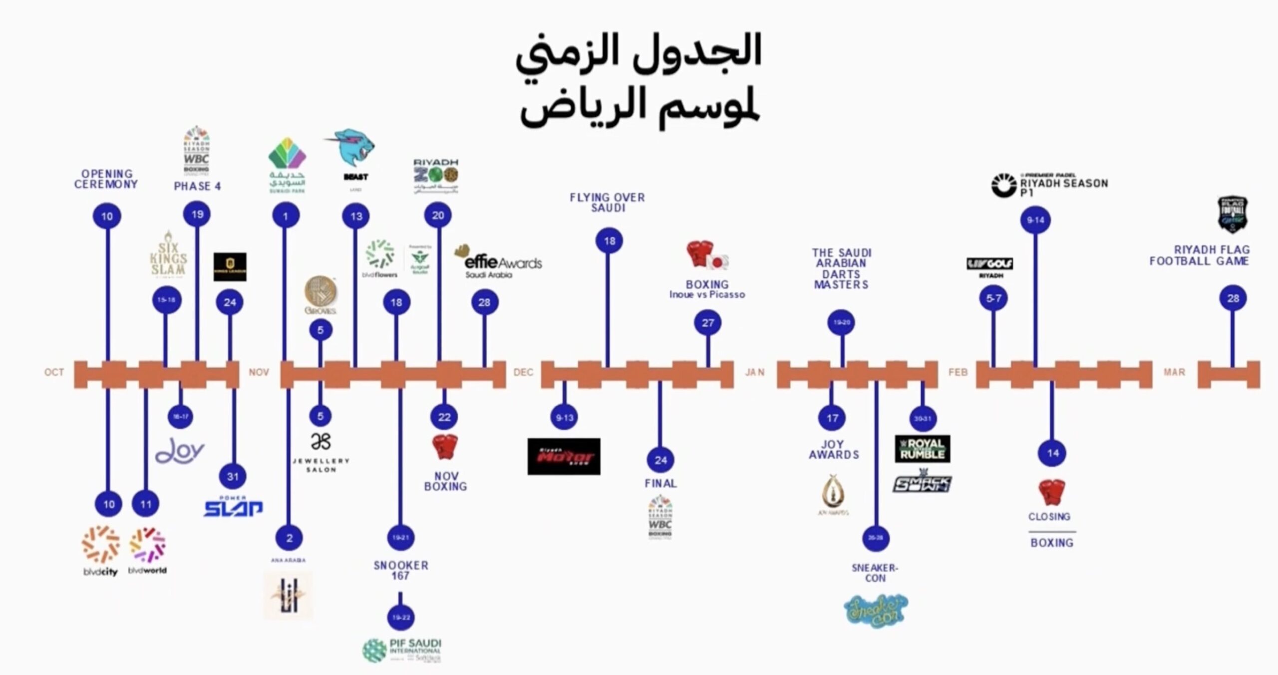 كما يضم الموسم مجموعة واسعة من الفعاليات الكبرى التي تشمل العروض الموسيقية والمسرحية والبطولات الرياضية العالمية، من بينها بطولات الملاكمة العالمية، وفعاليات WWE، وبطولة الغولف LIV، إضافة إلى فعاليات Joy Awards التي تحتفي بصنّاع الترفيه في العالم العربي.