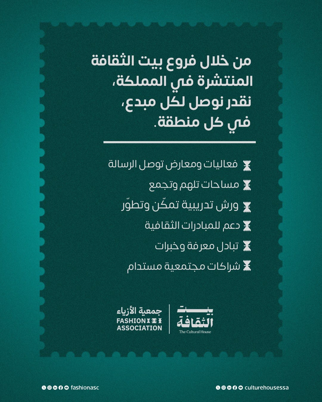 ويتميّز بيت الثقافة بانتشاره الجغرافي في مختلف مناطق المملكة، مما يسهم في تسهيل الوصول إلى الممارسين والمبدعين في القطاع، وتوسيع نطاق التأثير الثقافي لجمعية الأزياء على مستوى الوطن.