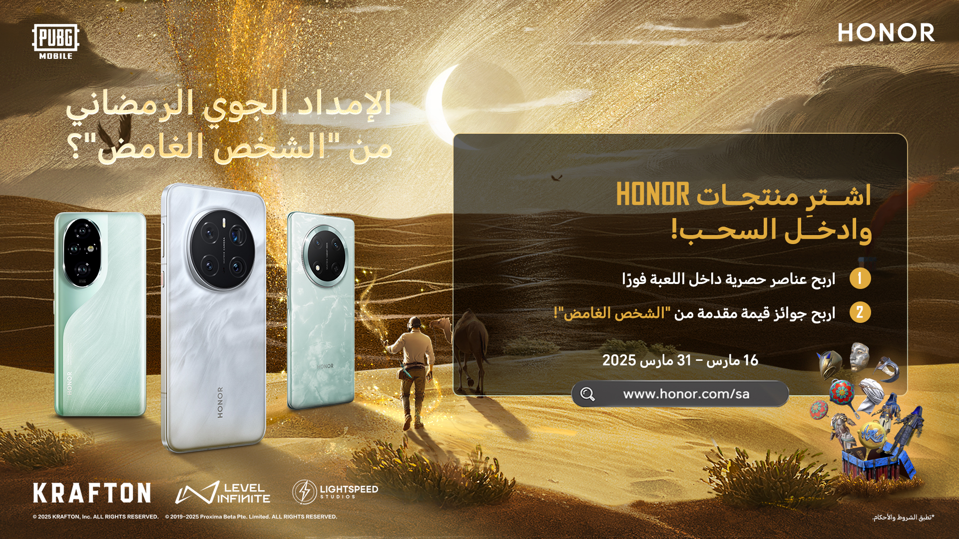 إلى جانب المكافآت الفورية، سيتم اختيار خمسة مشاركين محظوظين للفوز بهدية حصرية وقيّمة تُقدم شخصياً من قبل الشخصية الغامضة الشهيرة“Unknown Guy” من لعبة PUBG Mobile. سواء كنت من لاعبي PUBG Mobile المخلصين أو مجرد عاشق للألعاب بشكل عام، فإن هذه الفرصة الاستثنائية تتيح لك رفع مستوى تجربة اللعب الخاصة بك مع HONOR وPUBG Mobile إلى آفاق جديدة.