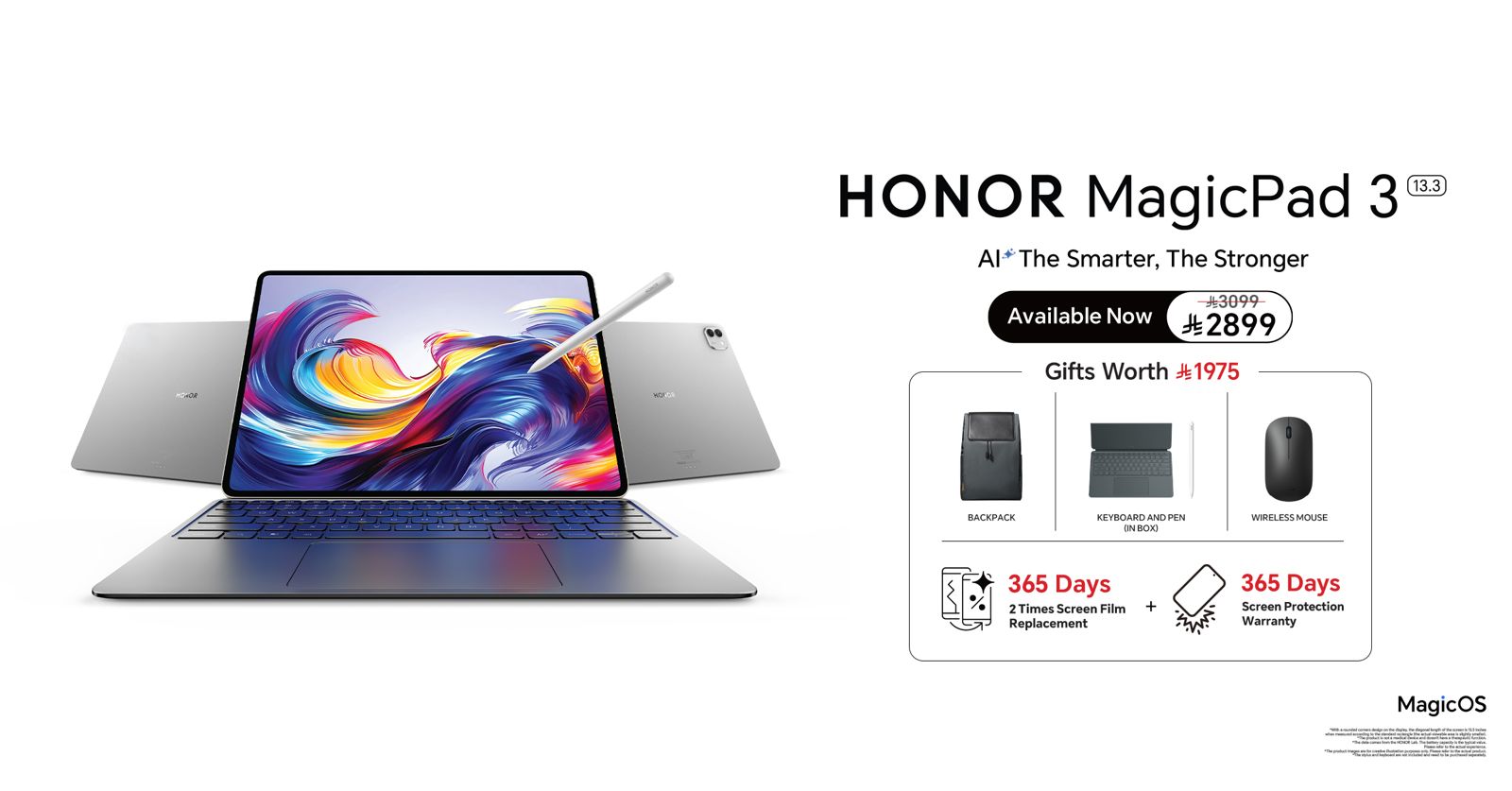 يتوفر جهاز HONOR MagicPad 3 باللون الرمادي بسعر 2,899 ريال سعودي. مع كل عملية شراء، سيحصل العملاء على هدايا مجانية بقيمة 1,975 ريال سعودي، تشمل ماوس لاسلكي، وقلمًا إلكترونيًا، ولوحة مفاتيح، وخدمة HONOR Care+ (ضمان حماية الشاشة لمدة 365 يومًا مع استبدال غشاء الشاشة مرتين خلال 12 شهرًا)، وحقيبة ظهر.