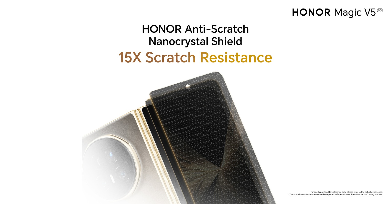 على الشاشة الخارجية، توفر حماية نانو كريستال المقاومة للخدوش من HONOR الجديدة المضاد للخدش ثلاث طبقات من الحماية، مما يوفر مقاومة أفضل للتآكل والسقوط، وأداءً مُحسّنًا ضد الخدش مقارنةً بالزجاجات الأخرى المستخدمة في الهواتف القابلة للطي حاليًا، مما يحافظ على قوة الشاشة الخارجية لهاتف Magic V5 وحمايتها من التلف اليومي. تتضمن هذه الشاشة تقنية تكشف المخاطر المحتملة، مما يوفر مقاومة أفضل للخدش بمقدار 15 مرة مقارنةً بالزجاج العادي. كما أنها تُعزز مقاومة السقوط بمقدار 10 مرات مقارنةً بالزجاج العادي.