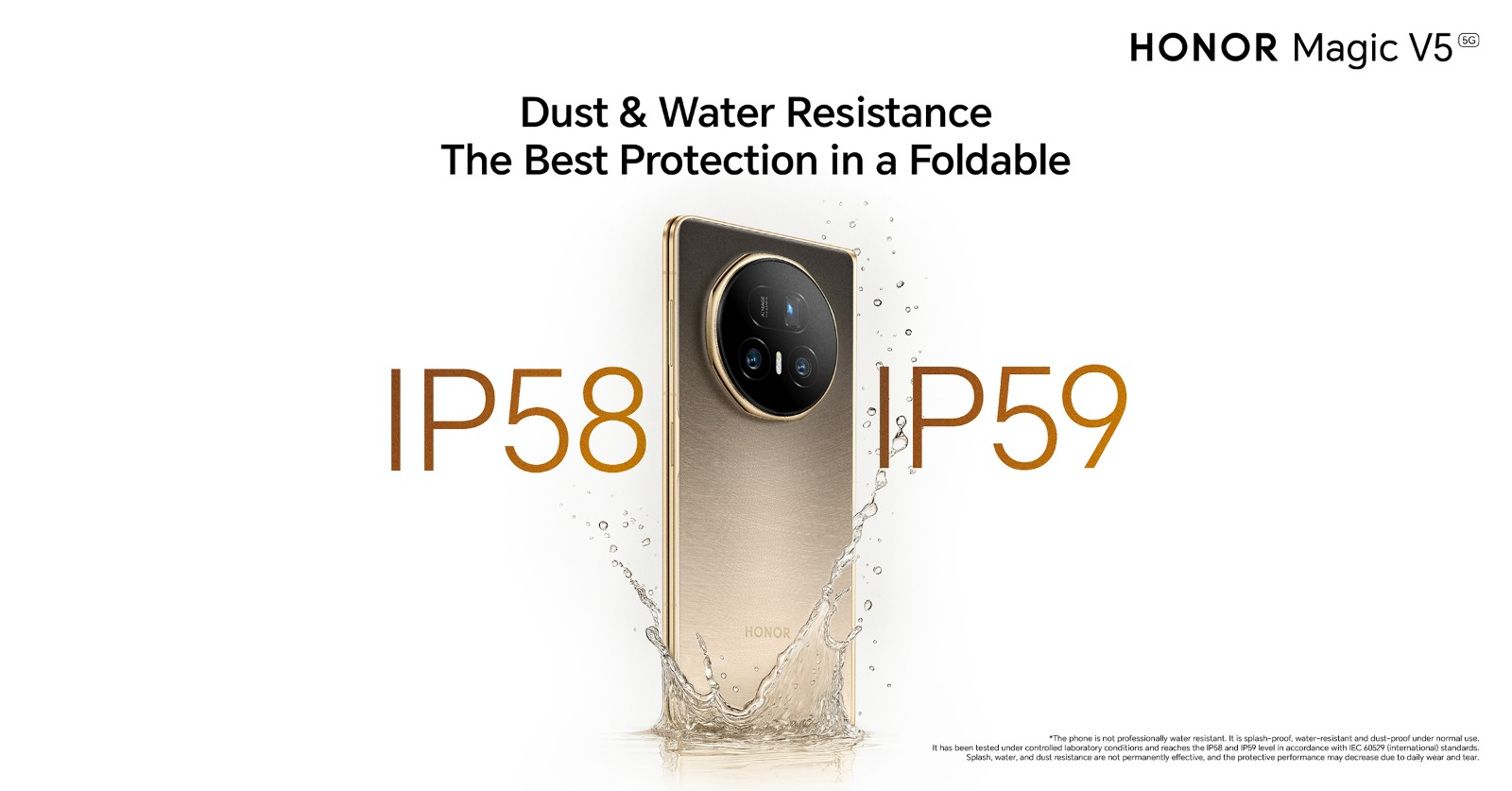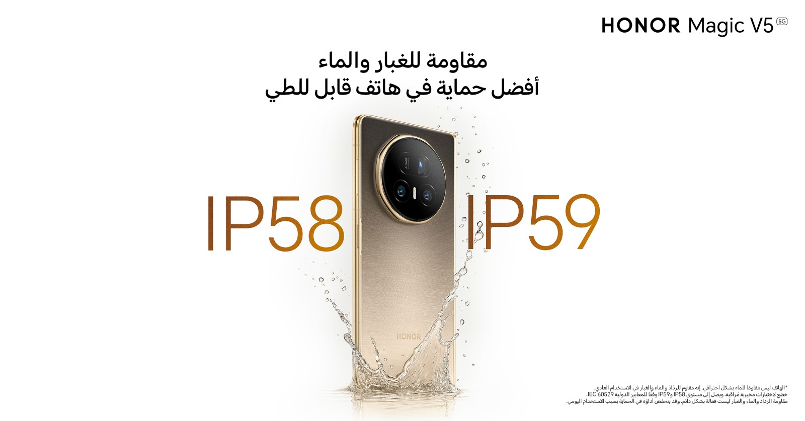 تم تصميم HONOR Magic V5 بهيكل هندسي متقدم ومواد عالية الجودة، مما مكّنه من الحصول على تصنيفي IP58 وIP59، مع تحسين مقاومة الغبار مقارنة بالجيل السابق، والقدرة على تحمل الغمر المستمر في الماء حتى عمق 1.5 متر. يوفّر هذا المستوى العالي من الحماية البيئية أداءً موثوقًا ومتانة استثنائية في البيئات الخارجية المعقّدة، مما يجعل HONOR Magic V5 مثاليًا للمغامرات اليومية والسيناريوهات الشاقة على حد سواء.