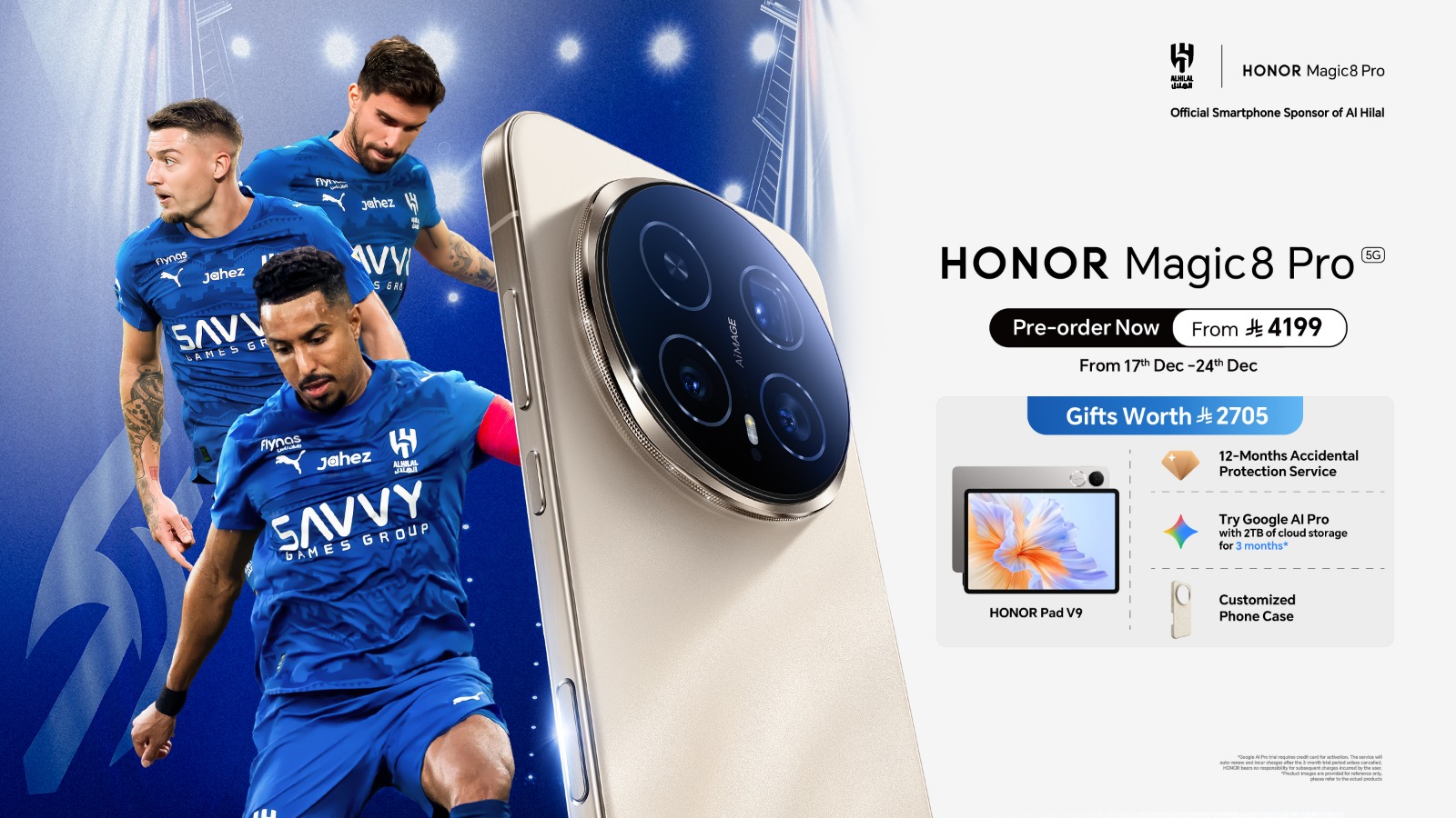 يتوفر هاتف HONOR Magic8 Pro بألوان الذهبي الشمسي Sunrise Gold والأسود Black ، ويبلغ سعره 4199 ريال سعودي للإصدار بسعة 512 جيجابايت و4899 ريال سعودي للإصدار بسعة 1 تيرابايت. سيحصل العملاء الذين يقومون بالطلب المسبق على هدايا مجانية بقيمة 2705 ريال سعودي، تشمل حماية شاملة من الأعطال لمدة 12 شهر، و HONOR Pad V9، واشتراك 3 أشهر Google AI Pro مع 2 تيرا بايت تخزين، وغطاء هاتف بتصميم خاص. وسيكون هاتف HONOR Magic8 Pro متاحًا للطلب المسبق عبر “قنوات البيع” المعتمدة.