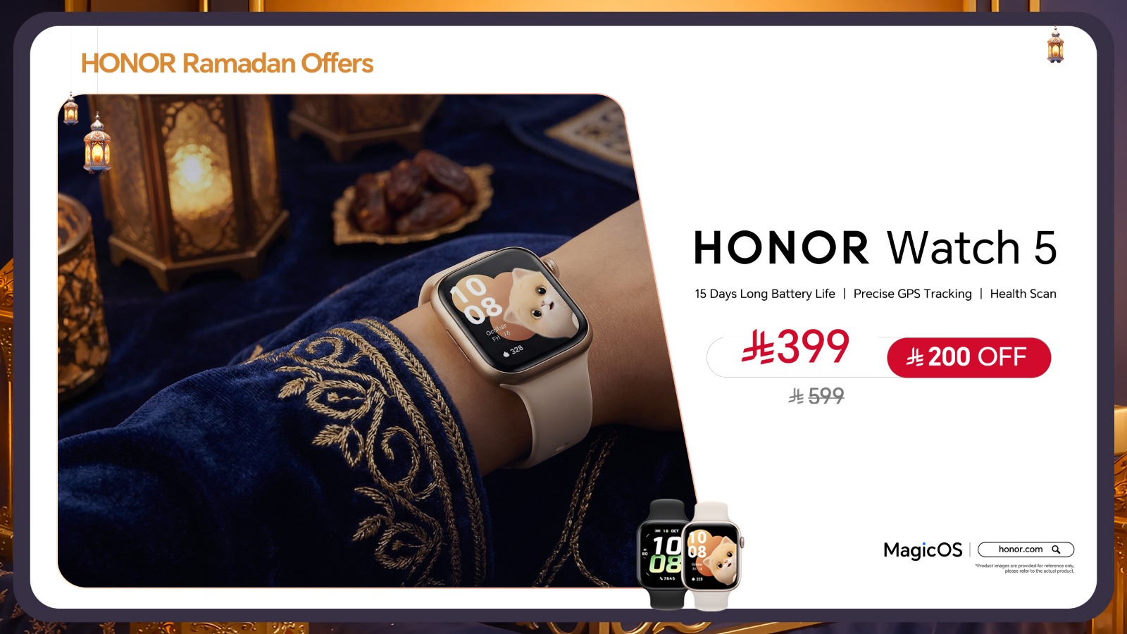 تتوفر ساعة HONOR Watch 5 خلال عروض رمضان بسعر مخفّض قدره 399 ريال سعودي بدلاً من 599 ريال سعودي، مع توفير يصل إلى 33%، لتُعد خيارًا مثاليًا للمستخدمين الراغبين في تعزيز تتبع اللياقة البدنية ونمط الحياة اليومي.