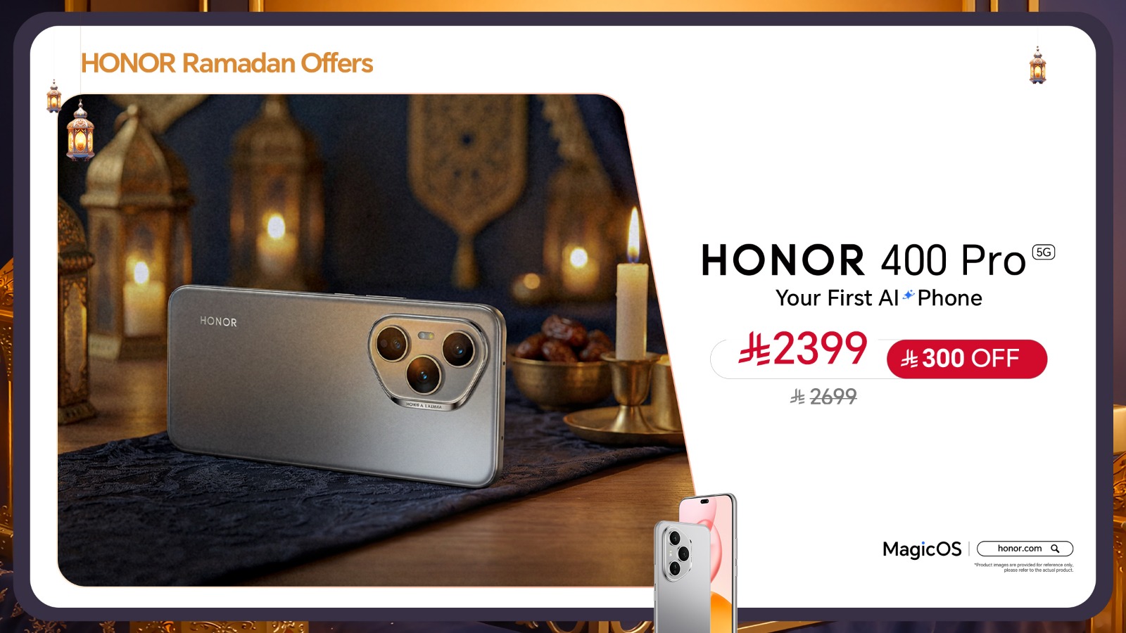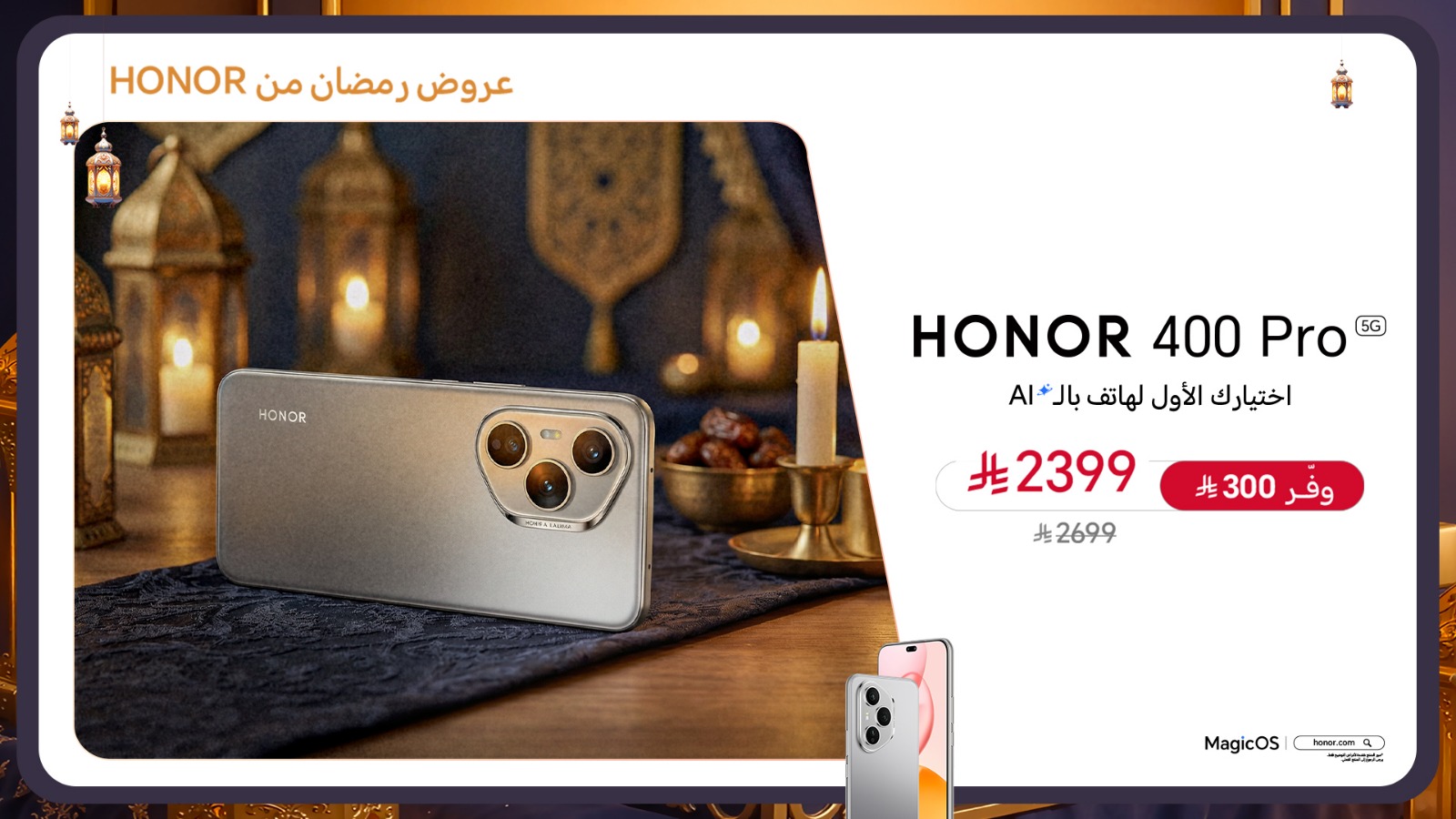 صُمم هاتف HONOR 400 Pro للمستخدمين الذين يقدّرون الأداء القوي والتصميم الأنيق، وهو متوفر خلال شهر رمضان بسعر خاص قدره 2,399 ريال سعودي بدلاً من 2,699 ريال سعودي، مما يتيح توفير 300 ريال سعودي. كما سيكون الهاتف مؤهلاً لخطط التقسيط بنسبة 0% ابتداءً من 24 فبراير.