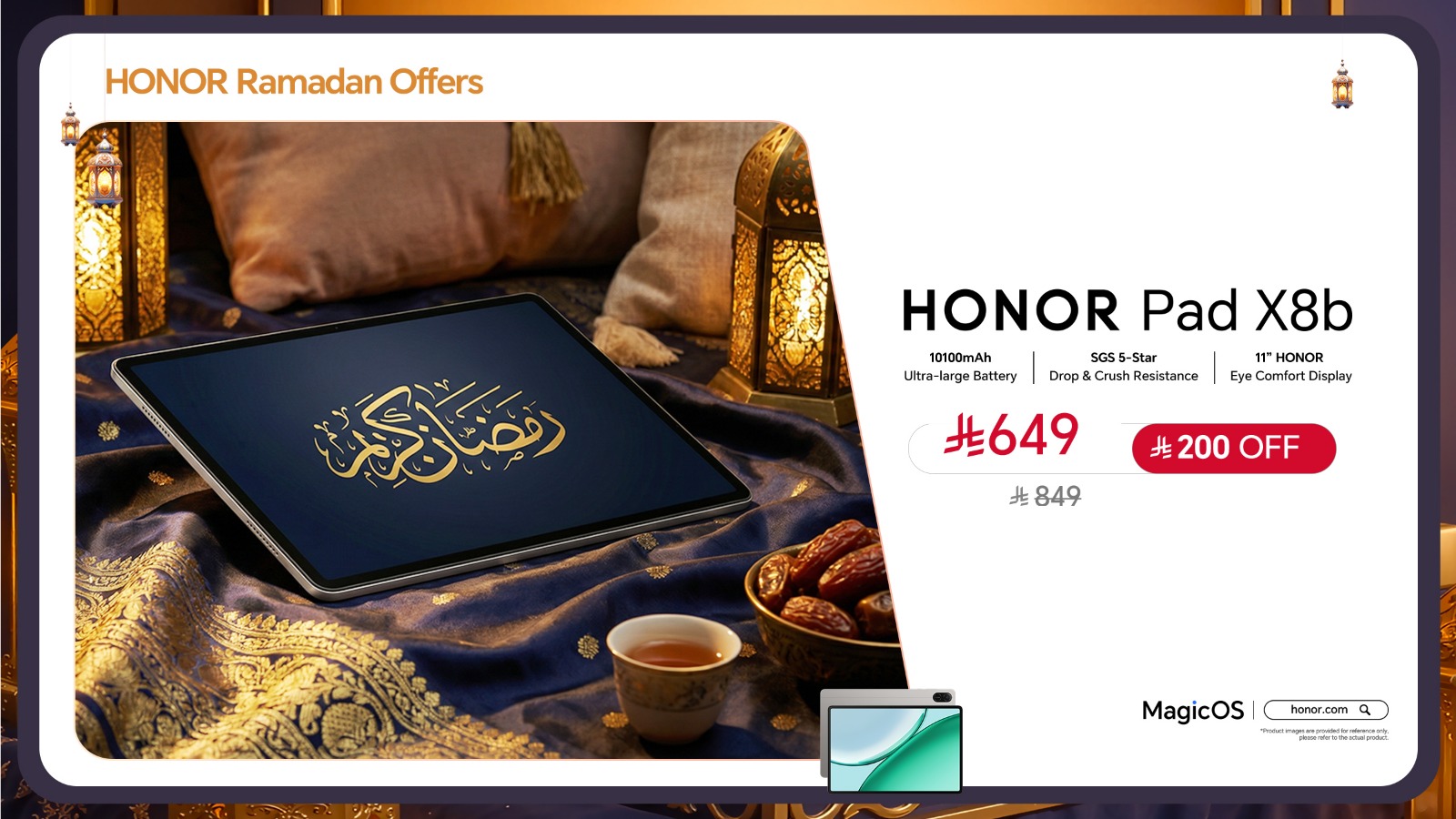 يوفّر جهاز HONOR Pad X8b WiFi تجربة جهاز لوحي مميزة بشاشة كبيرة، ويُعد خيارًا مثاليًا للترفيه والاستخدام اليومي. ويتوفر خلال عروض رمضان بسعر 649 ريال سعودي بدلاً من 849 ريال سعودي، مع حافظة HONOR للجهاز اللوحي مجانًا، مما يتيح توفيرًا بقيمة 200 ريال سعودي.