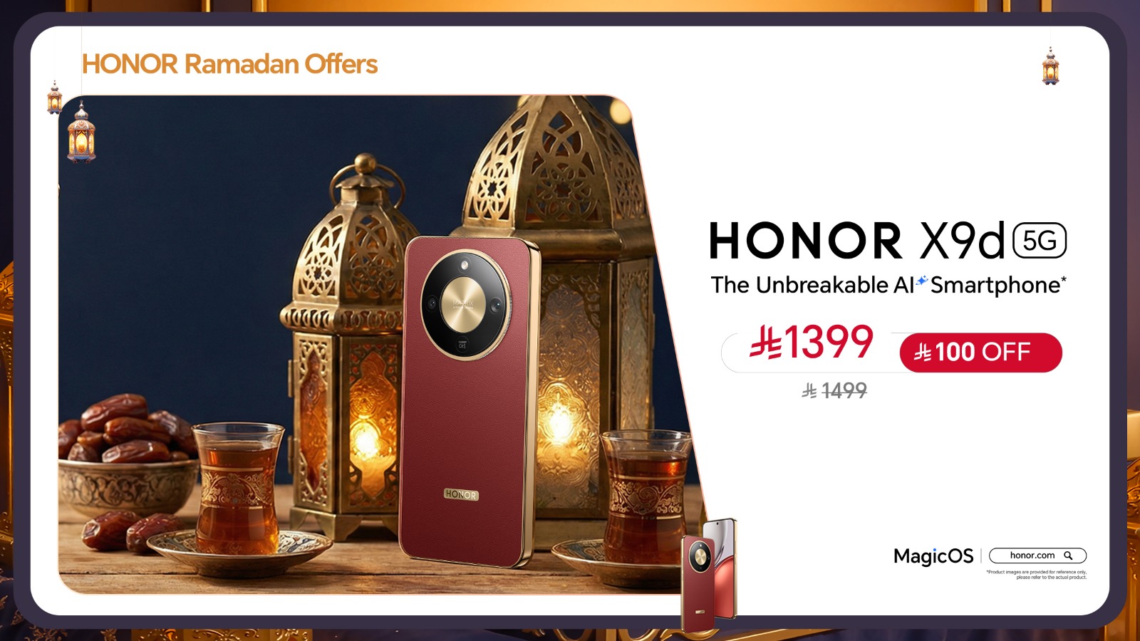 يقدّم هاتف HONOR X9d مزيجًا من المتانة والأداء السلس في تعدد المهام مع سعة تخزين كبيرة، وهو متوفر بسعر مخفّض قدره 1,399 ريال سعودي بدلاً من 1,499 ريال سعودي. كما تتوفر خيارات التقسيط ابتداءً من 24 فبراير.
