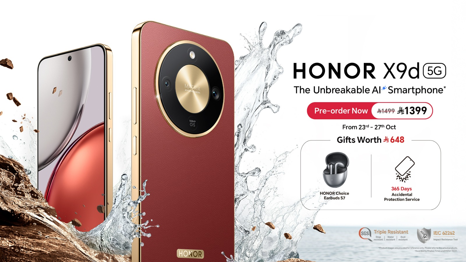 مصنف كـ “الهاتف المقاوم للكسر والمُعزز بالـ AI” في السوق، يُظهر هاتف HONOR X9d مقاومة شاملة للسقوط والماء والغبار مع شهادة الأداء الممتاز الثلاثي المقاومة من SGS، وهي الأولى من نوعها في الصناعة، بالإضافة إلى شهادة الموثوقية الشاملة ذات الخمس نجوم من SGS.