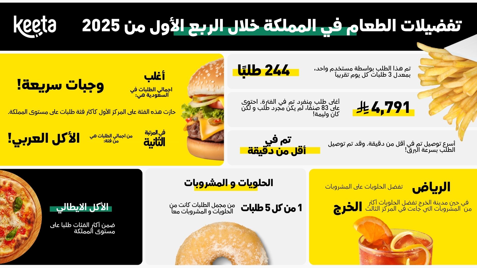 · كانت الوجبات السريعة الخيار الأول في مدن المملكة الرئيسية، بما في ذلك جدة، المدينة المنورة، ومكة المكرمة، فيما جاءت الرياض في المرتبة التالية، محافظةً على مركزها بين الأعلى طلبًا.