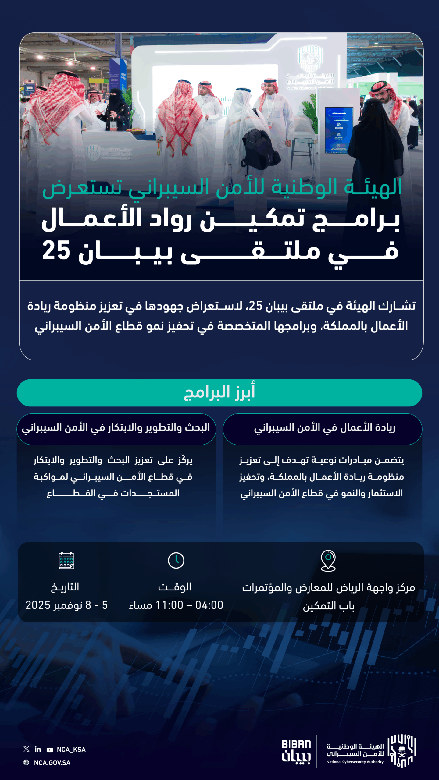 تشارك الهيئة الوطنية للأمن السيبراني في ملتقى بيبان 25، وذلك ضمن جهودها في تعزيز منظومة ريادة الأعمال بالمملكة، وتحفيز نمو قطاع الأمن السيبراني، وخلق بيئة تنافسية وابتكارية تجذب الاستثمار المحلي والدولي لسوق الأمن السيبراني، بما يسهم في تنميته ودعم الفرص الواعدة فيه.