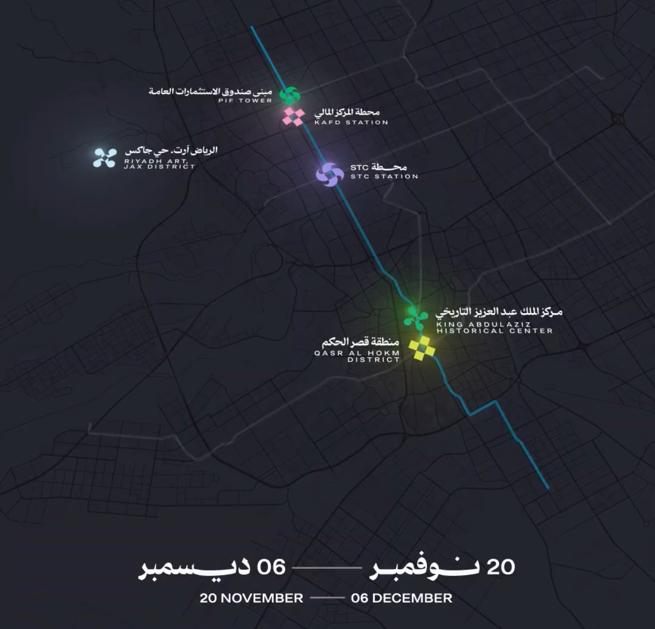 وأوضح المهندس خالد بن عبدالله الهزاني، نائب الرئيس بالهيئةالملكية لمدينة الرياض لقطاع نمط الحياة، المدير التنفيذي لبرنامج (الرياض آرت): “أن احتفال نور الرياض 2025 الذي سيقام خلال الفترة من 20 نوفمبر إلى 6 ديسمبر2025م على مدى 17 يومًا تحت شعار في لمح البصر، ستتوزع أعماله الفنّية في 6 مواقع رئيسة هي: (منطقة قصر الحكم، ومركز الملك عبد العزيز التاريخي، ومحطة STC، ومحطة المركز المالي، ومبنى صندوق الاستثمارات العامة، وحي جاكس)، مما يعكس التكامل في اختيار المواقع التي تُمثّل ماضي الرياض العريق وحاضرها المُتجدد، حيث سيربط الاحتفال بصريًا بين مراكز المدينة التاريخية ومعالمها الحديثة وفي مقدمتها (مشروع قطار الرياض)، وتحويل العاصمةإلى لوحة ضوئية مُتكاملة تُجسّد رؤيتها كمدينة عالمية نابضة بالإبداع.