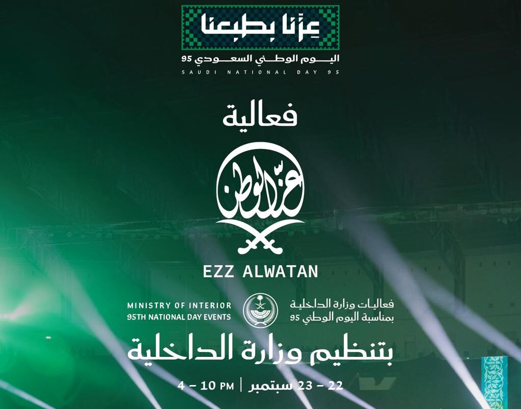 المملكة العربية السعودية، الرياض، 20 سبتمبر 2025: تقيم وزارة الداخلية، بالشراكة مع الهيئة العامة للترفيه (GEA)، فعالية “عز الوطن” احتفاءً باليوم الوطني الخامس والتسعين للمملكة، وذلك يومي 22 و 23 سبتمبر الجاري، في منطقة بنبان بمدينة الرياض، من الساعة الرابعة حتى العاشرة مساءً.