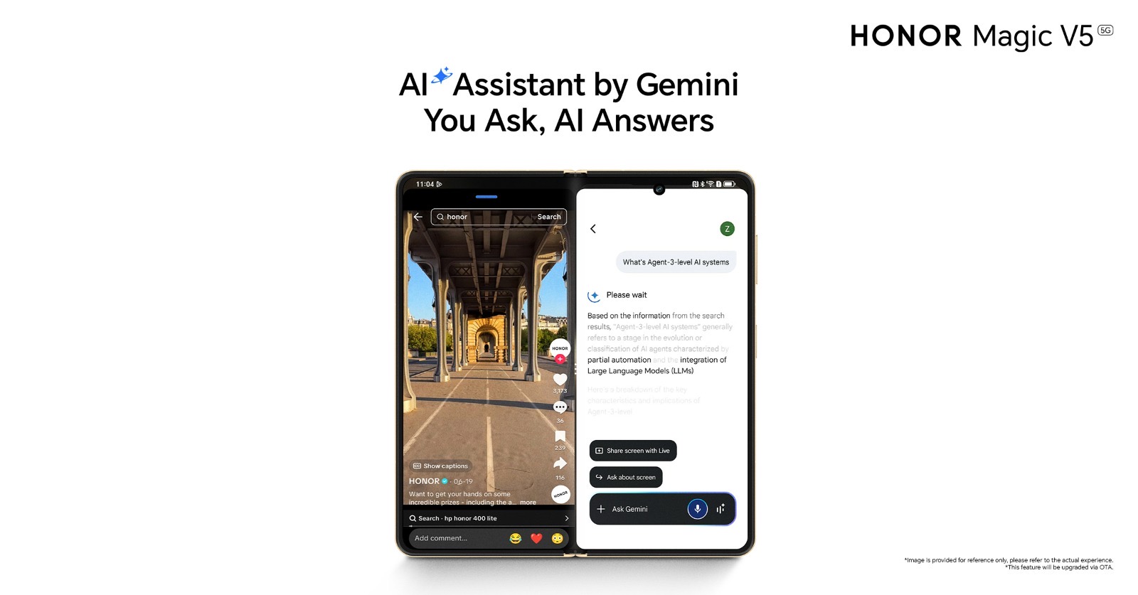 في صميم تفوق HONOR Magic V5 في مجال الإنتاجية، يأتي Google Gemini، المساعد الذكي المدمج المصمم لتبسيط سير العمل. يمكنك الدردشة مع Gemini للحصول على المساعدة في الكتابة، والتخطيط، والتعلم، وغير ذلك الكثير. أو يمكنك التحدث معه مباشرةً عبر Gemini Live لطرح الأفكار، وتبسيط المواضيع المعقدة، والتدرّب على اللحظات المهمة مع ردود فورية في الوقت الحقيقي. بل ويمكنك أن تطلب من Gemini مساعدتك بناءً على ما تراه، من خلال مشاركة الكاميرا أو الشاشة أثناء المحادثات في وضع Gemini Live.