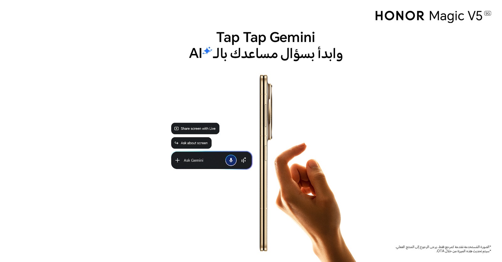 ما يميز Gemini هو سهولة الوصول إليه. بفضل ميزة Tap Tap، كل ما عليك هو النقر مرتين على الجزء الخلفي من جهاز Magic V5، وسيكون Gemini جاهزًا فورًا، دون الحاجة للبحث عن تطبيق أو الضغط على أزرار.