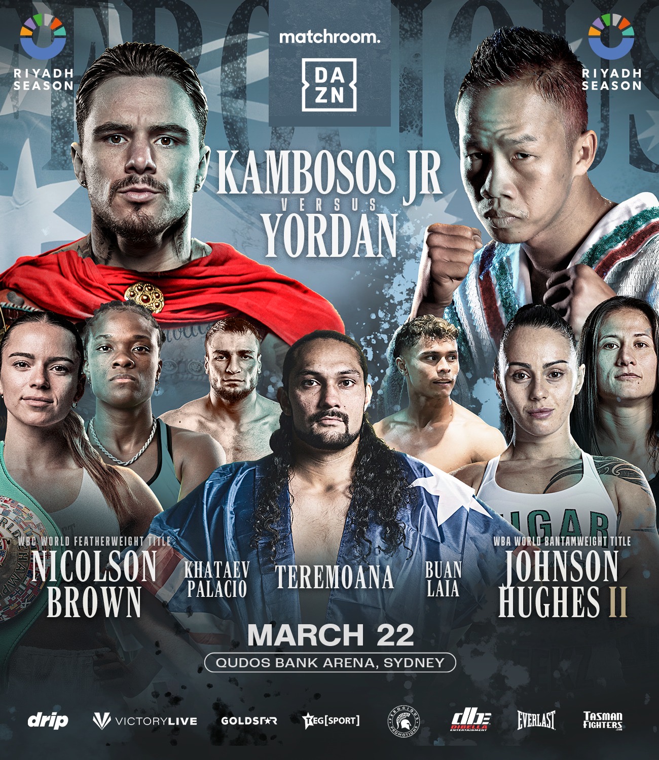 أستراليا، سيدني 13 مارس 2025: يرعى “موسم الرياض”، أحد أكبر نزالات الملاكمة في أستراليا، حين يعود جورج “فيروشوس” كامبوسوس جونيور إلى وطنه في ليلة نزال أسترالية ضخمة، حيث يواجه داود يوردان في نزال رئيسي مرتقب يوم السبت الـ 22 من شهر مارس الجاري، وذلك في بث مباشر عالمي عبر منصة DAZN، بالشراكة مع “دي بيلا إنترتينمنت” و”فيروشوس بروموشنز”، وبالتعاون مع “تسمان فايترز” و”جولدستار”.