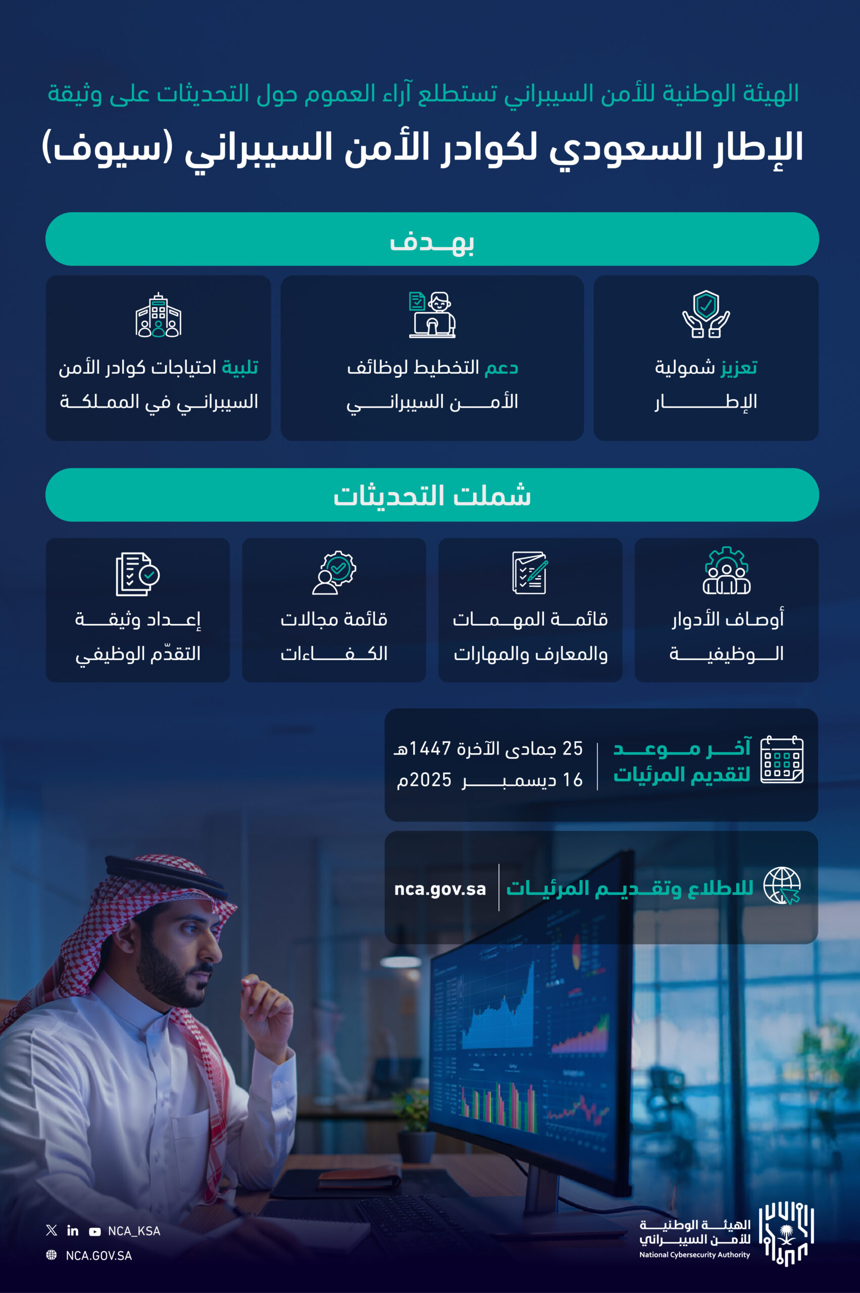 وتحث الهيئة الوطنية للأمن السيبراني الأفراد وكافة الجهات ذات العلاقة، لإبداء المرئيات حول التحديثات على وثيقة الإطار السعودي لكوادر الأمن السيبراني (سيوف)، ووثيقة التقدم الوظيفي، وحددت يوم الثلاثاء 25 جمادى الآخرة 1447هـ الموافق 16 ديسمبر 2025م آخر موعد لتلقي المرئيات، وذلك من خلال المنصة الإلكترونية الموحدة لاستطلاع آراء العموم “استطلاع” أو من خلال تعبئة نموذج تقديم المرئيات المتاح في الموقع الإلكتروني للهيئة وإرساله إلى:info@nca.gov.sa ، كما يمكن الحصول على نسخة من الوثيقتين وتقديم الملاحظات بشأنهما من خلال الموقع الإلكتروني للهيئة.