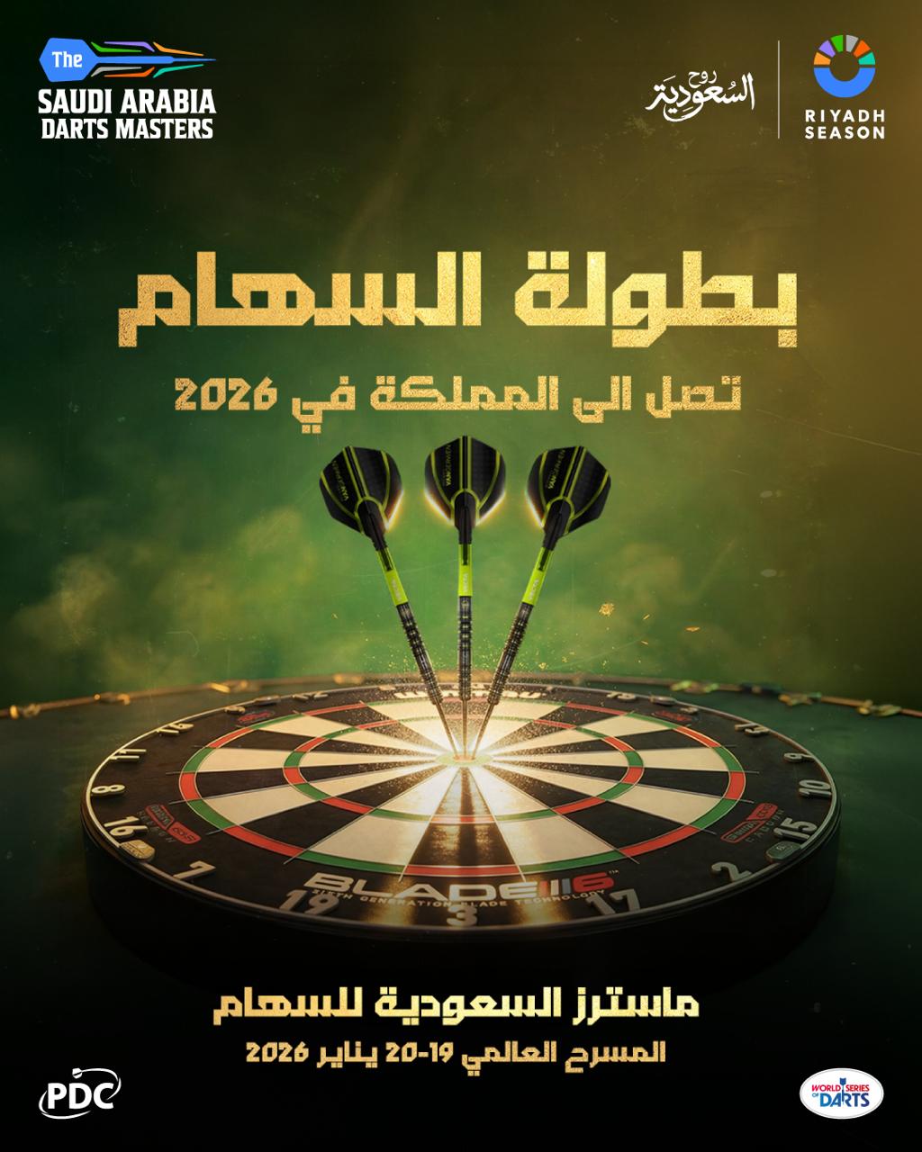 المملكة العربية السعودية، الرياض، 1 يناير 2026: أعلن معالي المستشار تركي بن عبدالمحسن آل الشيخ، رئيس مجلس إدارة الهيئة العامة للترفيه (GEA)، عن طرح تذاكر بطولة ماسترز السعودية للسهام 2026، التي تنطلق في 19 يناير 2026 ، بمشاركة نخبة من أبرز نجوم اللعبة على مستوى العالم، من بينهم الهولندي مايكل فان جيروين، والانجليزيين ستيفن بونتينج، و لوك همفريز، و لوك ليتلر، والويلزي جيروين برايس.