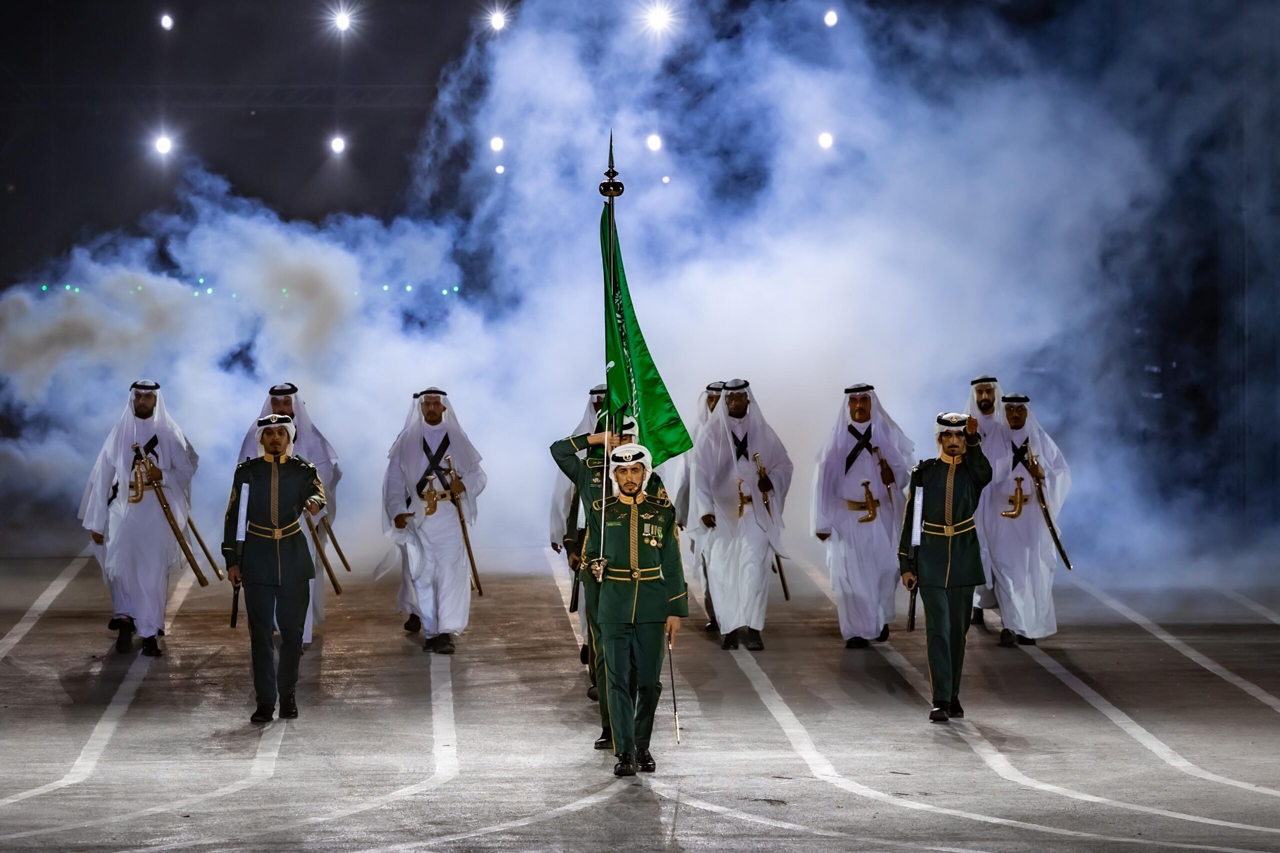 وتزامنت معها المسيرات البرية التي ضمّت آليات وعربات مختلفة، رافقتها الفرقة الموسيقية التي عزفت معزوفات وطنية ارتبطت بذاكرة السعوديين.