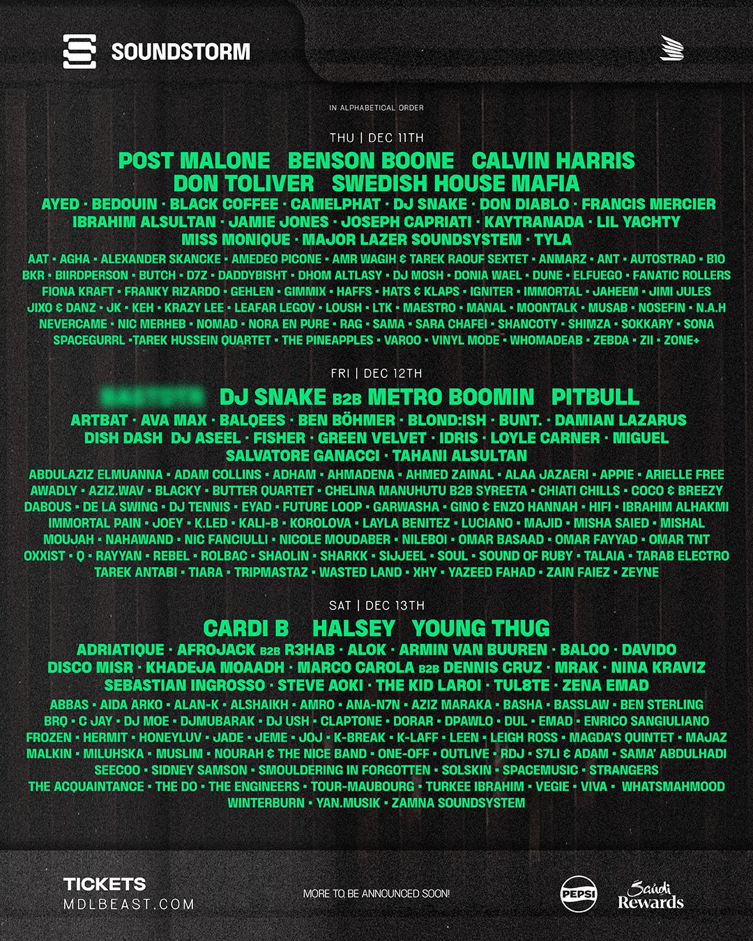 وينضم هؤلاء إلى مجموعة من أبرز النجوم العالميين، من بينهم دي جي سنيك الذي سيُشعل المسرح الرئيسي بعرض مشترك مع المنتج الأسطوري مترو بومين، أحد أبرز صناع موسيقى الهيب هوب في العالم، بالإضافة إلى الفنانة هالزي المعروفة بأسلوبها الجريء وصوتها المتفرّد، والنجم بوست مالون المعروف بأسلوبه المتنوع بين البوب والروك والراب، وبيتبول الذي سيُقدّم مجموعة من أنجح أغانيه التي أشعلت الساحات العالمية، إلى جانب النجم الصاعد بنسون بون، والفنانة كاردي بي التي تشتهر بحضورها القوي وأدائها الحيوي.