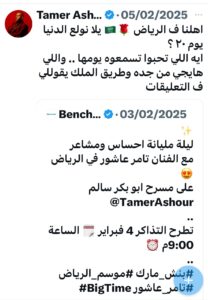 وتفاعل الفنان تامر عاشور مع جمهوره عقب إعلان الحفل عبر حسابات بنش مارك، حيث كتب: “أهلنا في الرياض، يلا نولع الدنيا يوم 20؟ أيه اللي تحبوا تسمعوه يومها؟ واللي هايجي من جدة وطريق الملك يقول لي في التعليقات.”