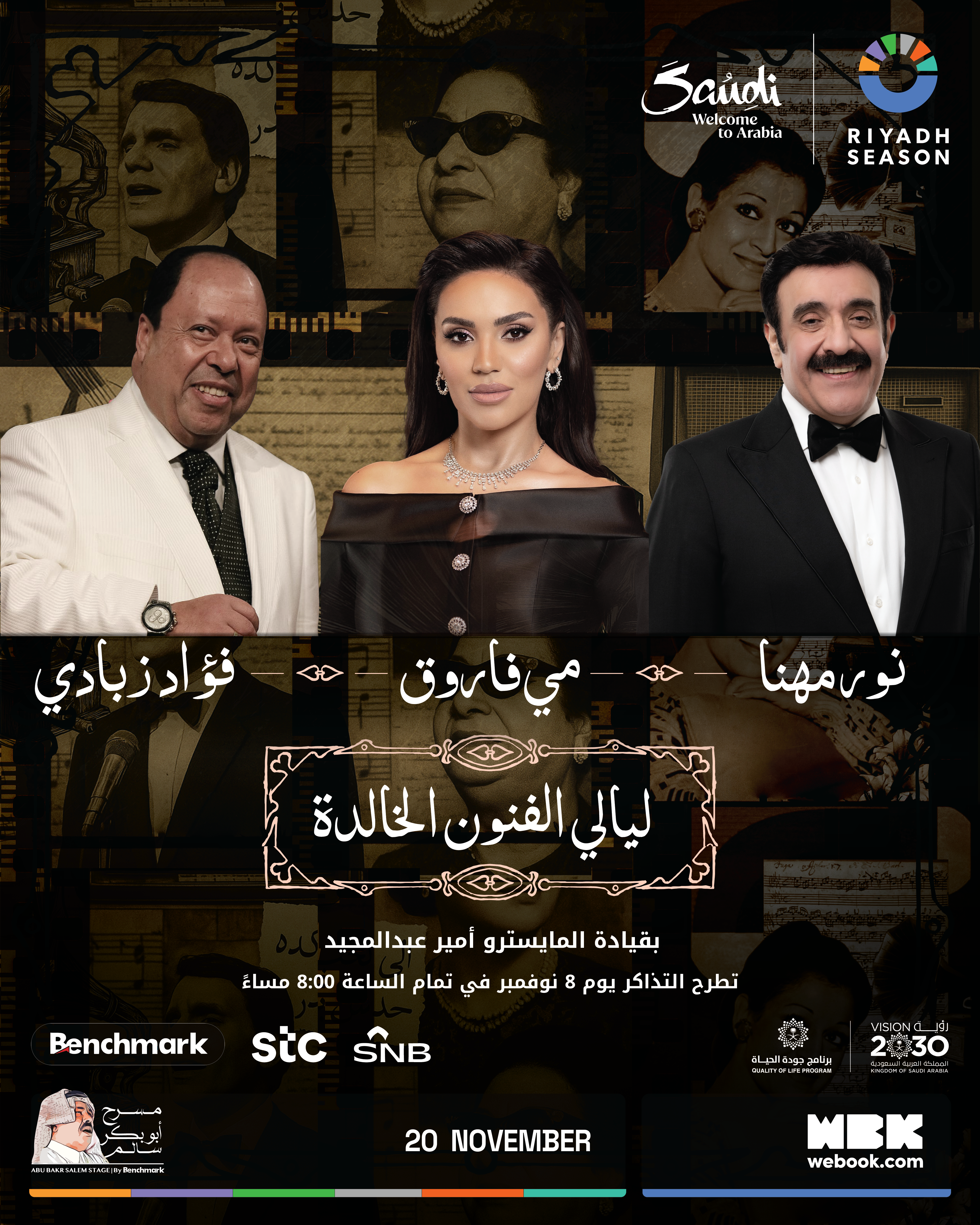 المملكة العربية السعودية، الرياض، 17 نوفمبر 2025: ليلةٌ تأسر القلوب وتعيد وهج العصر الذهبي، يجتمع فيها المطرب السوري صاحب المدرسة الطربية الأصيلة نور مهنا، والنجمة المصرية المتألّقة مي فاروق، والمطرب المغربي القدير فؤاد زبادي، لإحياء أمسية لا تُفوت على مسرح أبو بكر سالم، ضمن فعاليات موسم الرياض 2025.